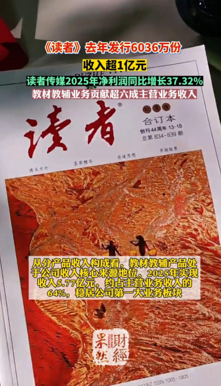 3月26日晚间, 读者传媒发布上市以来第十一份年报:2025年实现营业收入约9.04亿元,净利润约0.85亿元,归母净利润同比增长37.32%。从分产品收入构成看,教材教辅产品处于公司收入核心来源地位,2025年实现收入5.77亿元,约占主营业务收入的64%,稳居公司第一大业务板块。《读者》2025年月均发行量持续保持在500万册以上(含数字版),营业收入达1.09亿元,发行量达到6036万份。