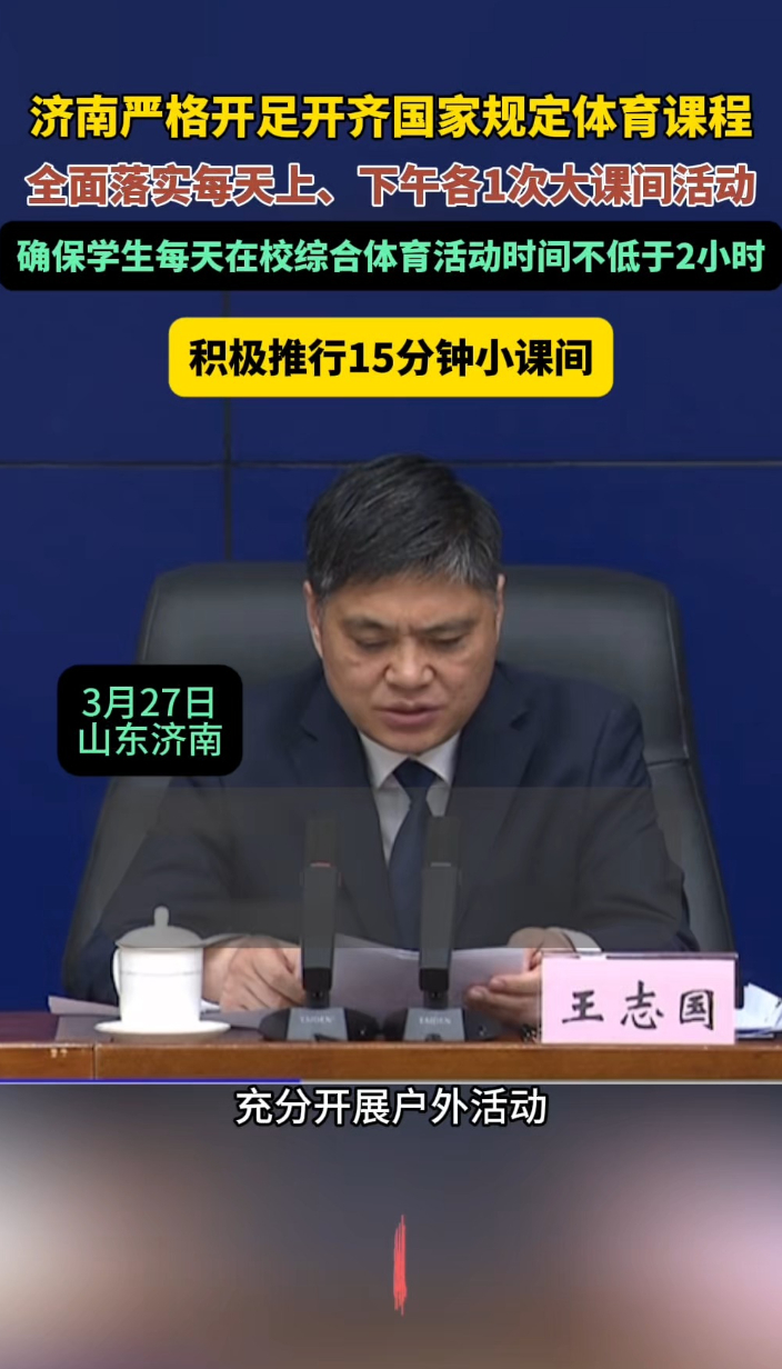 果然视频|济南市教育局积极推行“15分钟小课间”齐鲁晚报·齐鲁壹点客户端 18:43原创3月27日,济南市政府新闻办召开“以‘健康第一’理念引领‘好学校’建设”主题新闻发布会。会上,济南市教育局党组成员、副局长王志国表示,济南严格开足开齐国家规定体育课程,全面落实每天上、下午各1次大课间活动,确保学生每天在校综合体育活动时间不低于2小时;积极推行15分钟小课间。(齐鲁晚报·齐鲁壹点 史安琪)
