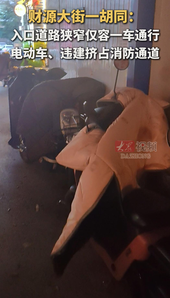 财源大街一胡同:道路狭窄仅容一车通行,电动车、违建占道大众新闻 昨天22:31原创近日,有网友在人民网留言板反映,财源大街三源家电西侧胡同为小区唯一车辆进出口,宽仅容一车通过,大量非居民电动车、摩托车占道停放,另有一处铁皮房违建。3月26日,记者走访发现,在下午6点左右胡同内铁皮房一侧停放了若干辆电动车,部分区域仅留窄道通行,网友反应的问题并未被解决。(大众新闻记者)
