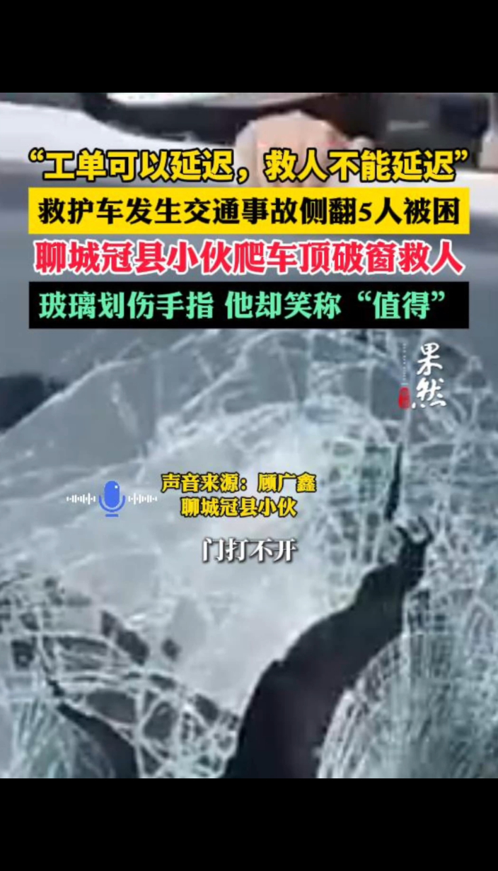 “工单可以延迟,救人不能延迟”聊城小伙在烟台路遇车祸救出5人大众报业·齐鲁壹点 16:353月23日上午10时许,烟台高新区科技大道与海澜路交叉口发生惊险一幕:一辆救护车通过路口时,与一辆私家车相撞后侧翻。危急时刻,过路的聊城冠县小伙顾广鑫毫不犹豫钻车踹窗救人,在热心市民的帮助下,将车内5人全部救出。(齐鲁晚报·齐鲁壹点 国晓宁)