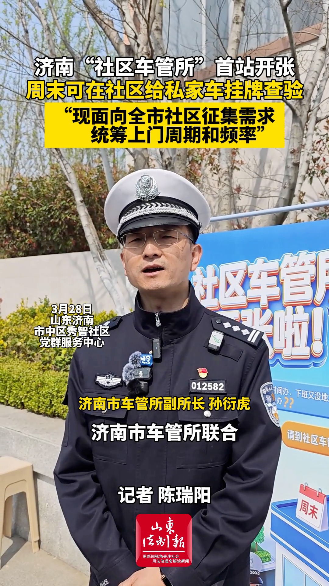 3月28日上午,济南市车管所联合邮政部门在市中区秀智社区党群服务中心推出“社区车管所”服务举措,将私家车挂牌查验、驾驶人查体换证等业务搬到社区,居民不出社区即可办理车驾管高频业务。济南市车管所副所长孙衍虎在采访中表示,现面向全市社区发出邀约,对于人员集中、需求量大的社区均可开展进社区上门服务,有意向的社区居委会可拨打好办车管热线66712345进行洽谈合作。(大众新闻·山东法制报记者 陈瑞阳)