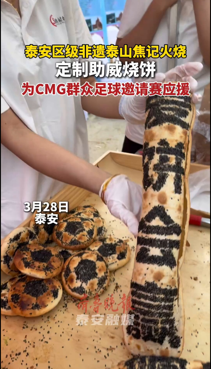 果然视频|泰安区级非遗泰山焦记火烧定制助威烧饼,为CMG群众足球邀请赛应援齐鲁晚报·齐鲁壹点客户端 19:23原创齐鲁晚报·齐鲁壹点 徐慧 3月28日,CMG群众足球邀请赛首日,泰安区级非遗泰山焦记火烧定制助威烧饼,为球赛应援。