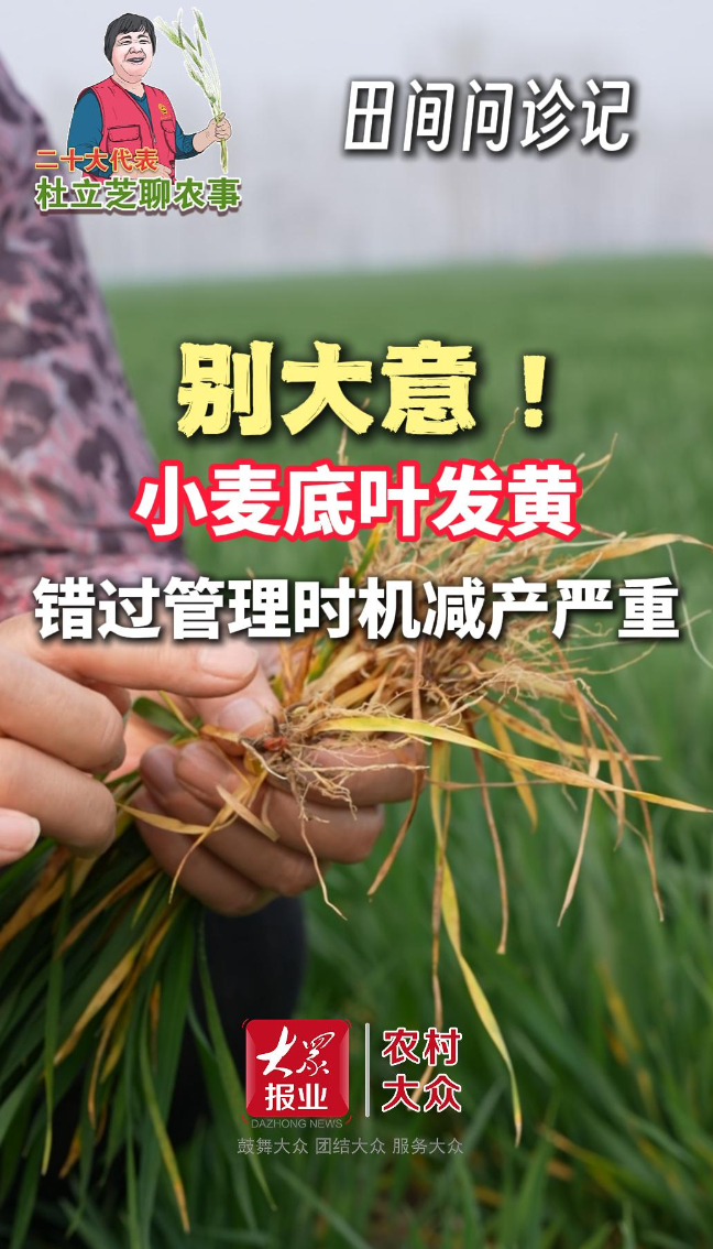 杜立芝聊农事·田间问诊记丨小麦底叶发黄,到底咋回事?别瞎治! 21:11 原创大众新闻·农村大众 微信扫码扫码下载客户端小麦底叶发黄,到底咋回事?别瞎治!很多老乡一看叶子黄了,就急着浇水追肥,钱花了,地却伤了!到底该咋办?为此,杜立芝老师特地来麦田给大家“把脉问诊”。发黄是缺肥?还是病害?根系变弱咋补救?底叶发黄到底该不该管?杜老师讲得清楚明白,都是咱们农民用得上的真技术!点开视频,听听专家咋说,别让一年的辛苦毁在“不懂”上!(大众新闻·农村大众记者 李新宇)