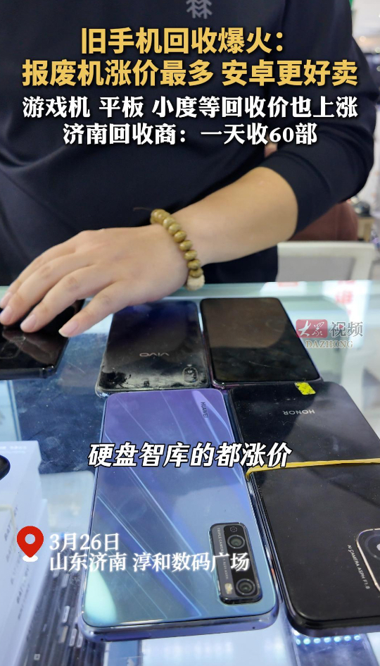 探访济南旧手机回收市场:安卓机更好卖,商户一天收60台大众新闻 08:49原创近日,在济南二手电子产品回收市场,旧手机的市场热度持续攀升。搭载内存芯片的安卓手机、平板、游戏机等其回收价全线走高,相机内存卡行情也出现明显涨幅。有的商户单日收货数量可达60台旧手机,统一批量发往深圳进行芯片拆解深加工。(大众新闻记者 贾馨儒)