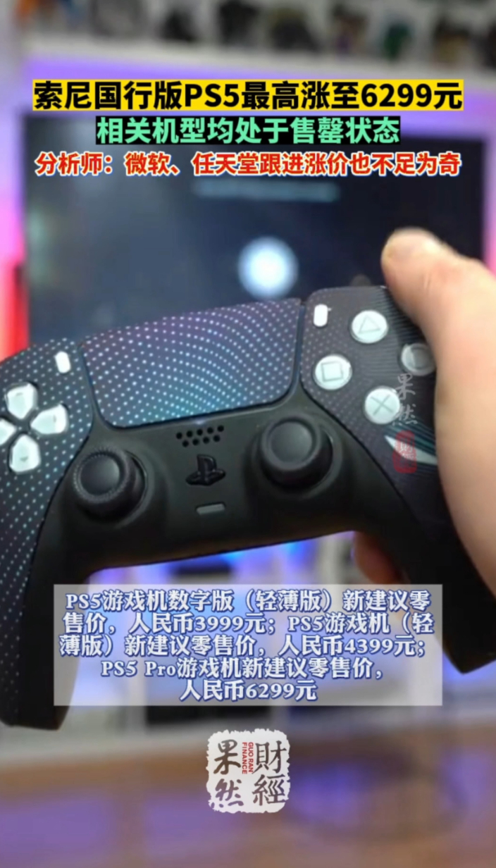 果然财经|全球经济承压背锅?索尼国行PS5全机型涨价齐鲁壹点 | 14:21 原创齐鲁晚报·齐鲁壹点客户端 微信扫码扫码下载客户端27日晚,索尼PlayStation中国方面表示,受全球经济持续承压影响,将上调国行PS5轻薄版与PS5 Pro的建议零售价,新价格自4月2日起正式生效。其中PS5轻薄版数字版从3499元涨至3999元,涨价500元;PS5游戏机轻薄版从4299元涨至4399元,上调100元;PS5 Pro从5599元涨至6299元,涨700元。