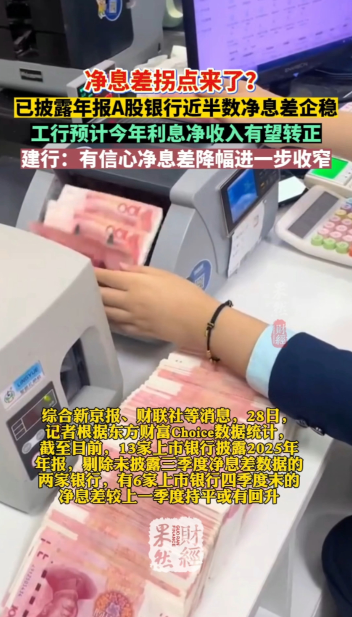 果然财经|拐点来了!多家上市银行净息差跌势放缓齐鲁壹点 | 14:20 原创齐鲁晚报·齐鲁壹点客户端 微信扫码扫码下载客户端截至目前,13 家上市银行披露 2025 年年报,剔除未披露三季度净息差数据的两家银行,6 家银行四季度净息差环比持平或回升。工行预判 2026 年利息净收入同比转正、迎来拐点,净息差降幅将进一步收敛。建行表示将强化主动负债管理,稳住净息差,力争降幅收窄,并维持同业领先水平,银行业息差承压态势有望缓和。