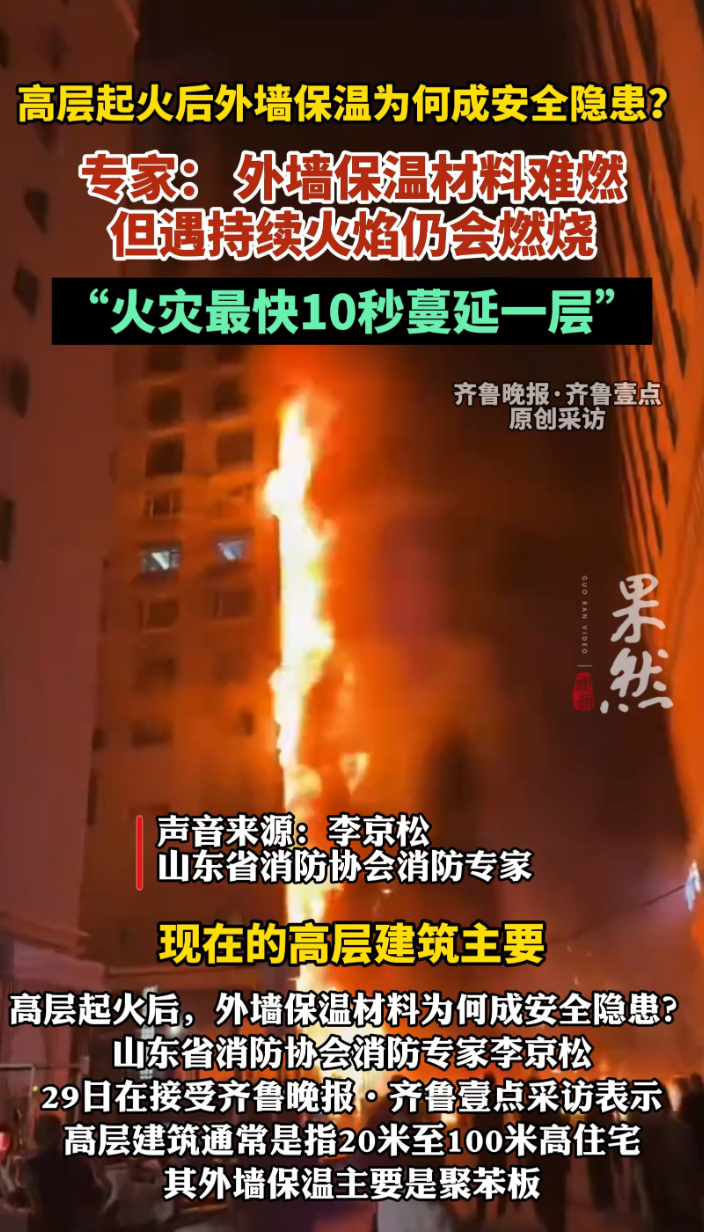 果然视频|起火后,外墙保温材料为何成安全隐患?齐鲁晚报·齐鲁壹点客户端 16:00原创29日,山东省消防协会消防专家李京松在接受齐鲁晚报·齐鲁壹点采访表示,高层建筑通常是指20米至100米高住宅,其外墙保温主要是聚苯板。他表示,聚苯板属于B1级难燃材料“难燃不代表不燃,在火焰作用下燃烧仍会持续或者燃烧较慢。”李京松告诉记者,一般高层火灾20秒蔓延一层,后期甚至最快10秒蔓延一层。(齐鲁晚报·齐鲁壹点 路董萌 杨涛 胡玲玲)