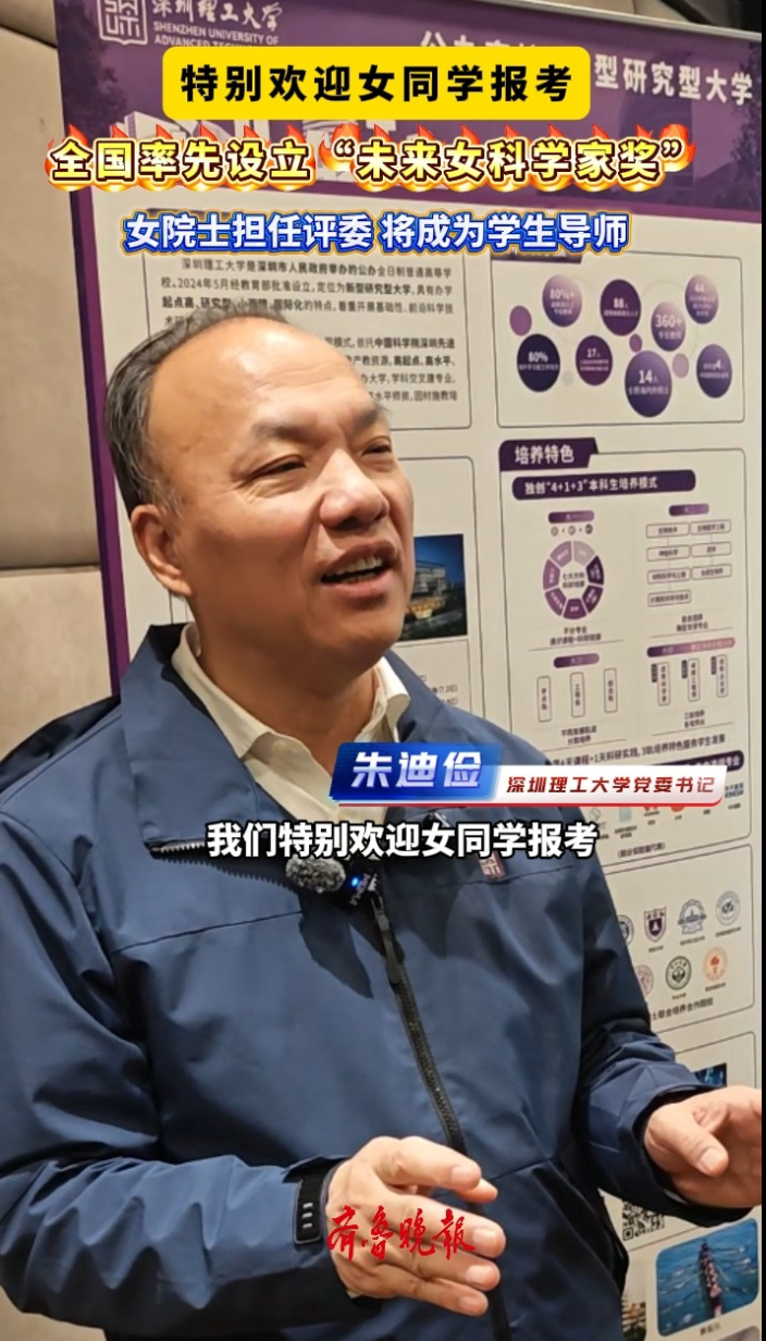 果然视频丨欢迎女同学报考!全国率先设立“未来女科学家奖”齐鲁晚报·齐鲁壹点客户端 17:21原创3月28日上午,深圳理工大学在山东青岛举办城市宣讲会,该校党委书记朱迪俭在会上透露,深圳理工大学2026年将首次在山东招收本科生,预计招26人左右。在采访中,朱迪俭提到,也特别欢迎女同学报考,学校在全国设立“未来女科学家奖”,由女院士评选,一旦选中女院士将担任获奖者的导师。 (齐鲁晚报·齐鲁壹点记者 尚青龙)