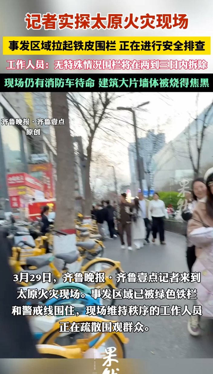 果然视频|记者实探太原火灾现场,正排查安全隐患,消防车待命齐鲁晚报·齐鲁壹点客户端 20:23原创3月29日,齐鲁晚报·齐鲁壹点记者实地探访28日晚太原亲贤北街火灾现场。事发区域已被警戒线围住,现场仍有消防车待命,建筑大片墙体被烧得焦黑。据现场一位维持秩序的工作人员介绍,目前正开展安全隐患排查,现场围栏将在两到三日内拆除。据此前央视新闻报道,该火灾目前遇难人数已升至3人,另有23人受伤,其中9人伤势较重。(齐鲁晚报·齐鲁壹点爆料电话:0531-85193656)