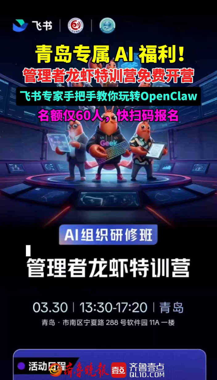 果然视频丨青岛专属AI福利!管理者龙虾特训营免费开营齐鲁晚报·齐鲁壹点客户端 11:05原创青岛企业管理者专属福利!飞书联合权威机构打造的OpenClaw龙虾特训营免费开营,3月30日在青岛软件园开课。飞书专家手把手教部署、使用OpenClaw,从0到1打造数字员工,全程实操+专属资料+一对一答疑,名额仅60人,扫码报名,带电脑解锁AI办公新技能! (齐鲁晚报·齐鲁壹点记者 张晓鹏)