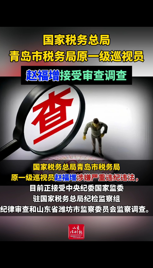 国家税务总局青岛市税务局原一级巡视员赵福增接受纪律审查和监察调查山东法制报 | 16:27 现场山东省纪委监委网站 微信扫码扫码下载客户端国家税务总局青岛市税务局原一级巡视员赵福增涉嫌严重违纪违法,目前正接受中央纪委国家监委驻国家税务总局纪检监察组纪律审查和山东省潍坊市监察委员会监察调查。