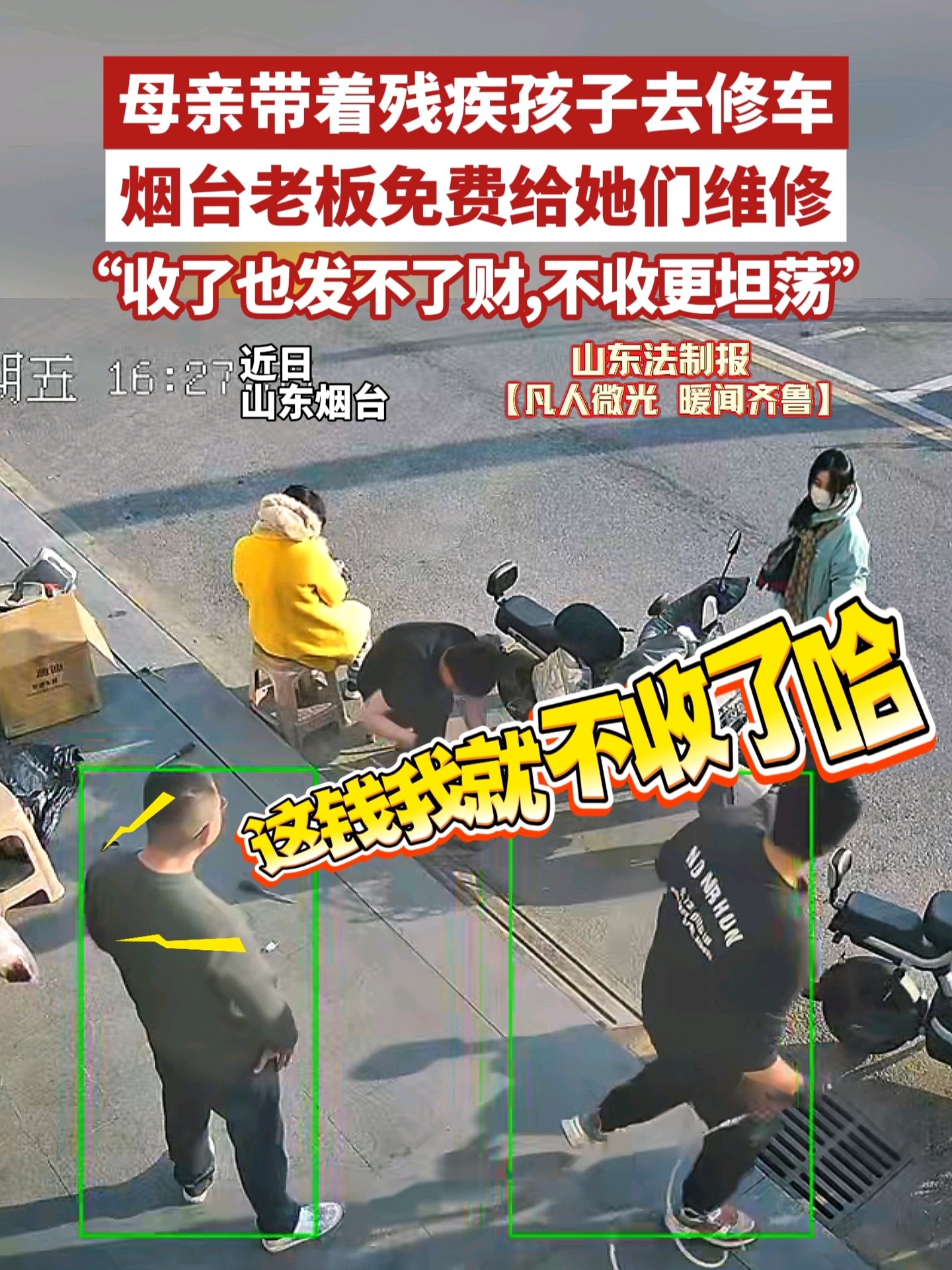母亲带着残疾孩子去修车,烟台老板暖心免单:“收了也发不了财,不收更坦荡” 16:27 原创山东法制报 微信扫码扫码下载客户端3月20日,在烟台福山区一家修车店内,店老板宋先生为一位带着残疾孩子的母亲修理电动车后,执意拒收修车费。他说,这一百块钱,就留给孩子买点吃的吧。(大众新闻·山东法制报记者 羊文智)