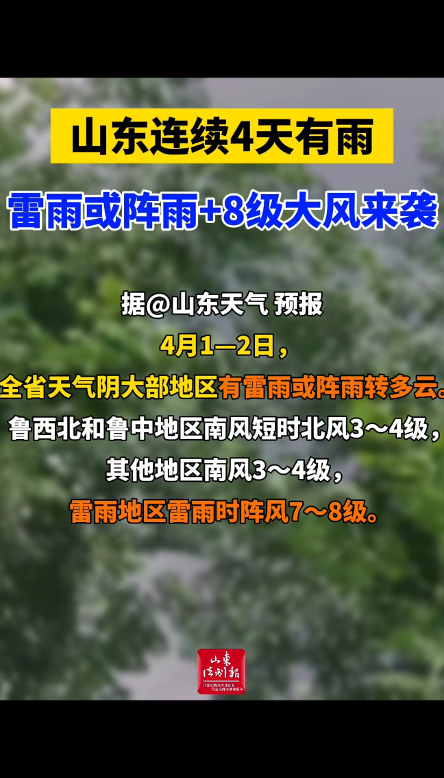 据@山东天气 预报:4月1—2日,全省天气阴大部地区有雷雨或阵雨转多云。鲁西北和鲁中地区南风短时北风3~4级,其他地区南风3~4级,雷雨地区雷雨时阵风7~8级。