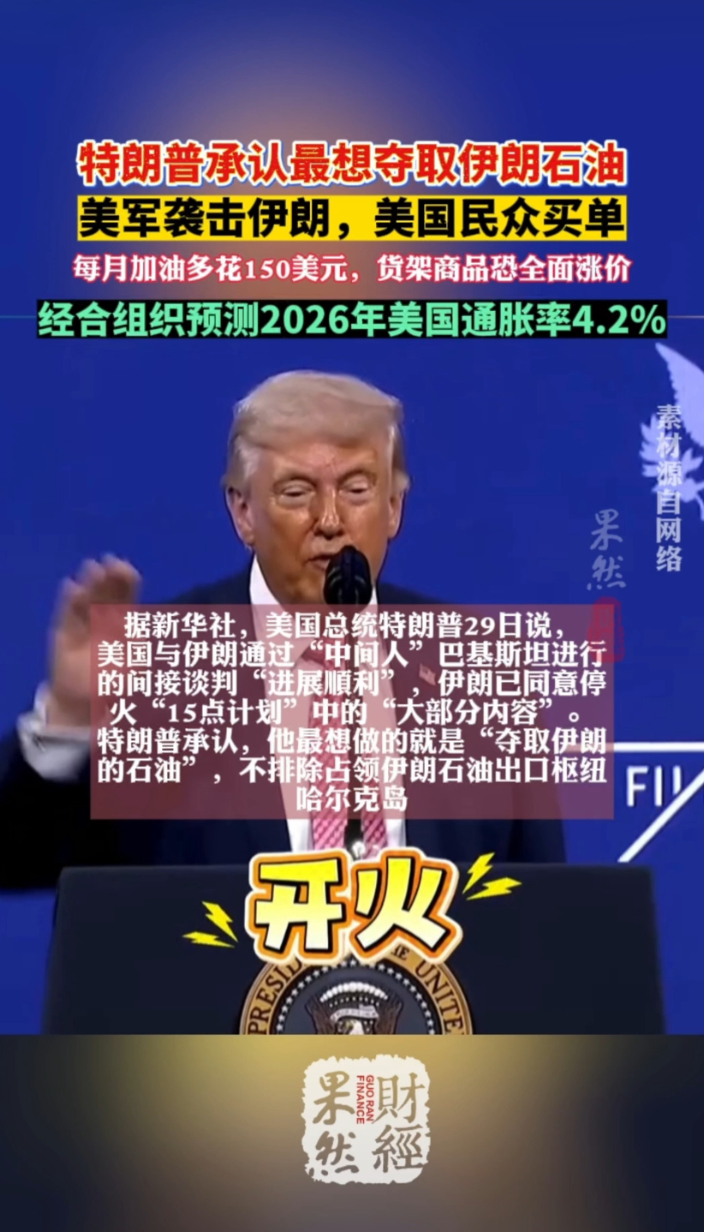 新华社消息,美国总统特朗普29日说,美国与伊朗通过“中间人”巴基斯坦进行的间接谈判“进展顺利”,伊朗已同意停火“15点计划”中的“大部分内容”。特朗普承认,他最想做的就是“夺取伊朗的石油”,不排除占领伊朗石油出口枢纽哈尔克岛。美国对伊朗的袭击反噬自身经济,油价飙升致民众生活成本增加,打乱经济复苏节奏。经合组织预测2026年美国通胀率将达4.2%,远超美联储预期。