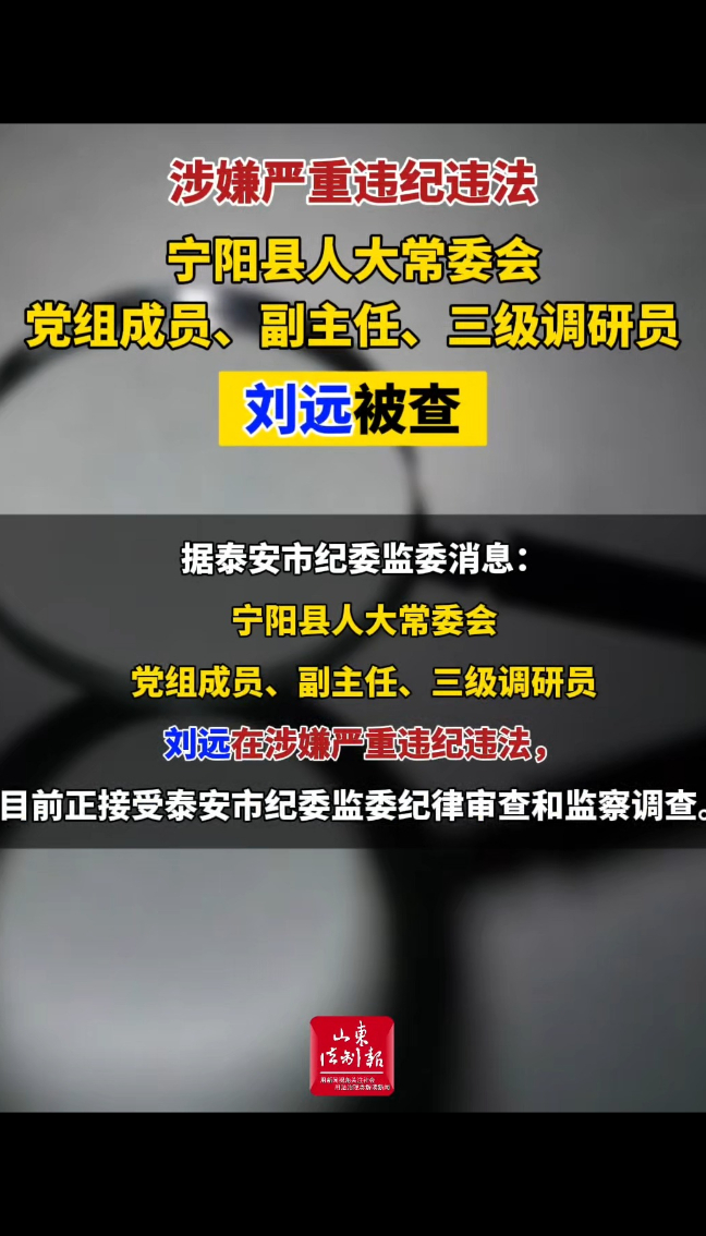 涉嫌严重违纪违法 宁阳县人大常委会党组成员、副主任、三级调研员刘远被查 18:27 山东省纪委监委网站 微信扫码扫码下载客户端据泰安市纪委监委消息:宁阳县人大常委会党组成员、副主任、三级调研员刘远在涉嫌严重违纪违法,目前正接受泰安市纪委监委纪律审查和监察调查。