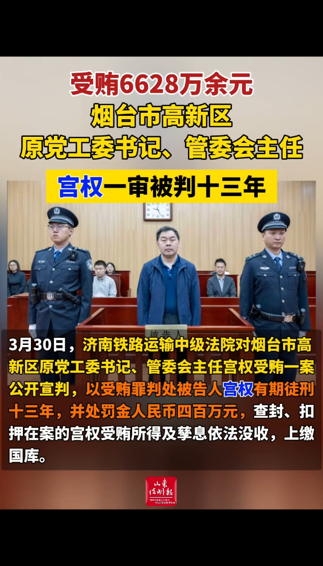 3月30日,济南铁路运输中级法院对烟台市高新区原党工委书记、管委会主任宫权受贿一案公开宣判,以受贿罪判处被告人宫权有期徒刑十三年,并处罚金人民币四百万元,查封、扣押在案的宫权受贿所得及孳息依法没收,上缴国库。