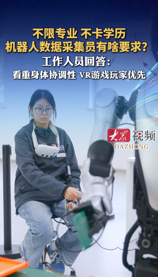 不限专业学历,机器人数据采集员有啥要求?工作人员回答:看重身体协调性,VR游戏玩家优先大众新闻 08:49原创3月25日,位于济南市平阴县的乐聚(济南)人形机器人数据训练中心正式启用。乐聚(济南)人形机器人数据训练中心数采组组长于庆宇介绍,机器人数据采集员不限制专业和学历,但要求身体协调性好,有VR游戏经验优先。采集员记录的每一条动作数据,对应了13个实用场景,这些数据会经过标记、清洗后上传至云端,用于AI大模型的数据运算。(大众新闻记者 凌志 卢鹏 杨学莹)