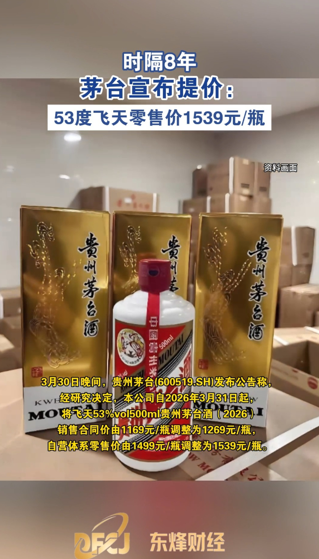 东烽财经|时隔8年,茅台宣布提价:53度飞天零售价1539元/瓶黄三角早报 | 15:05 原创大众新闻·黄三角早报 微信扫码扫码下载客户端3月30日晚间,贵州茅台(600519.SH)发布公告称,经研究决定,本公司自2026年3月31日起,将飞天53%vol500ml贵州茅台酒(2026)销售合同价由1169元/瓶调整为1269元/瓶,自营体系零售价由1499元/瓶调整为1539元/瓶。(大众新闻记者 杨珣)