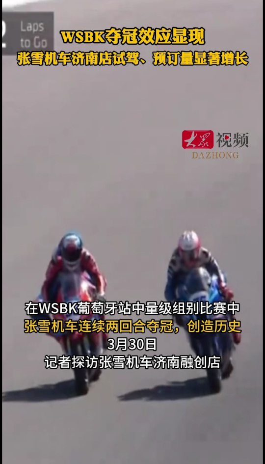 探访张雪机车济南门店:WSBK夺冠效应显现 试驾、预订量显著增长大众新闻客户端 15:30原创在世界超级摩托车锦标赛(WSBK)葡萄牙站中量级组别比赛中,张雪机车(ZXMOTO)自主研发的820RR-RS赛车,连续两回合夺冠,打破了欧美日多年来对冠军的垄断。3月30日,记者探访张雪机车济南融创店,据该店店长介绍,在夺冠效应影响下,店里的试驾量、预订量都显著增长。(大众新闻记者 刘建宏 王建 实习生 金蓉)