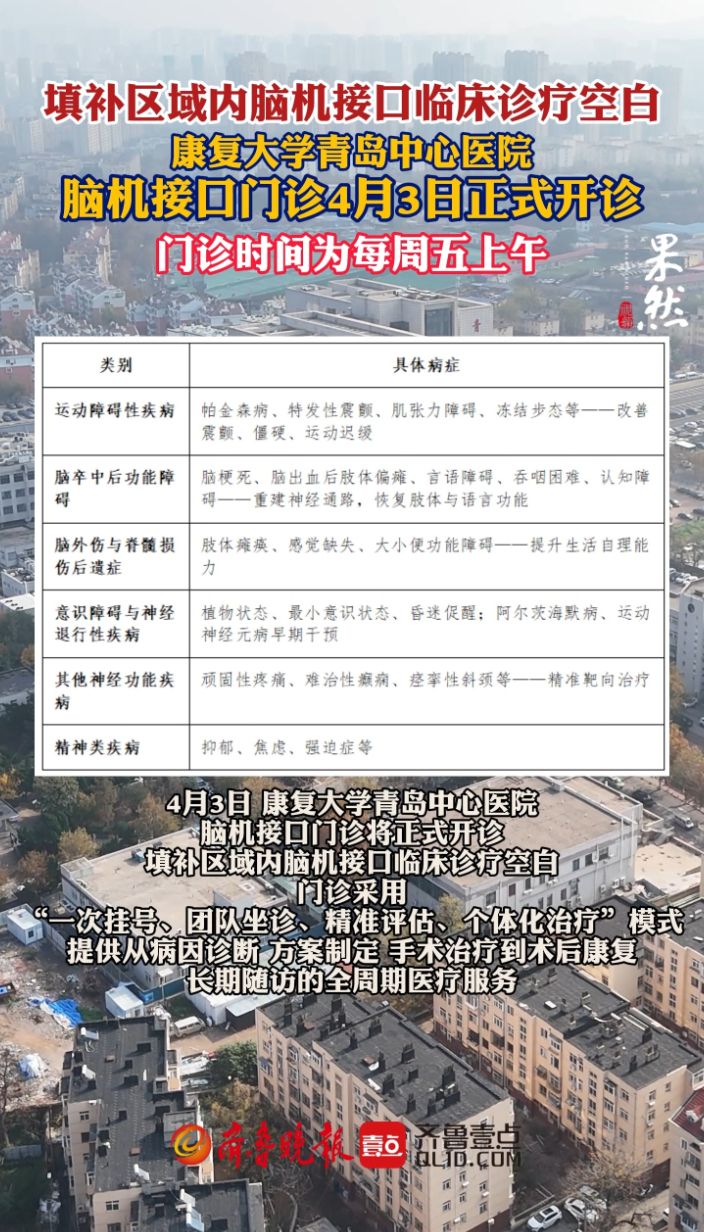 果然视频丨康复大学青岛中心医院脑机接口门诊4月3日开诊齐鲁晚报·齐鲁壹点客户端 16:37原创4月3日,康复大学青岛中心医院脑机接口门诊将正式开诊,填补区域内脑机接口临床诊疗空白。门诊依托顶尖医疗团队与前沿脑机接口技术,为神经系统及运动功能障碍患者提供精准、高效、创新的诊疗方案。门诊时间为每周五上午,门诊地点为康复大学青岛中心医院1号楼3楼神经内科脑机接口门诊。 (齐鲁晚报·齐鲁壹点 李自强)