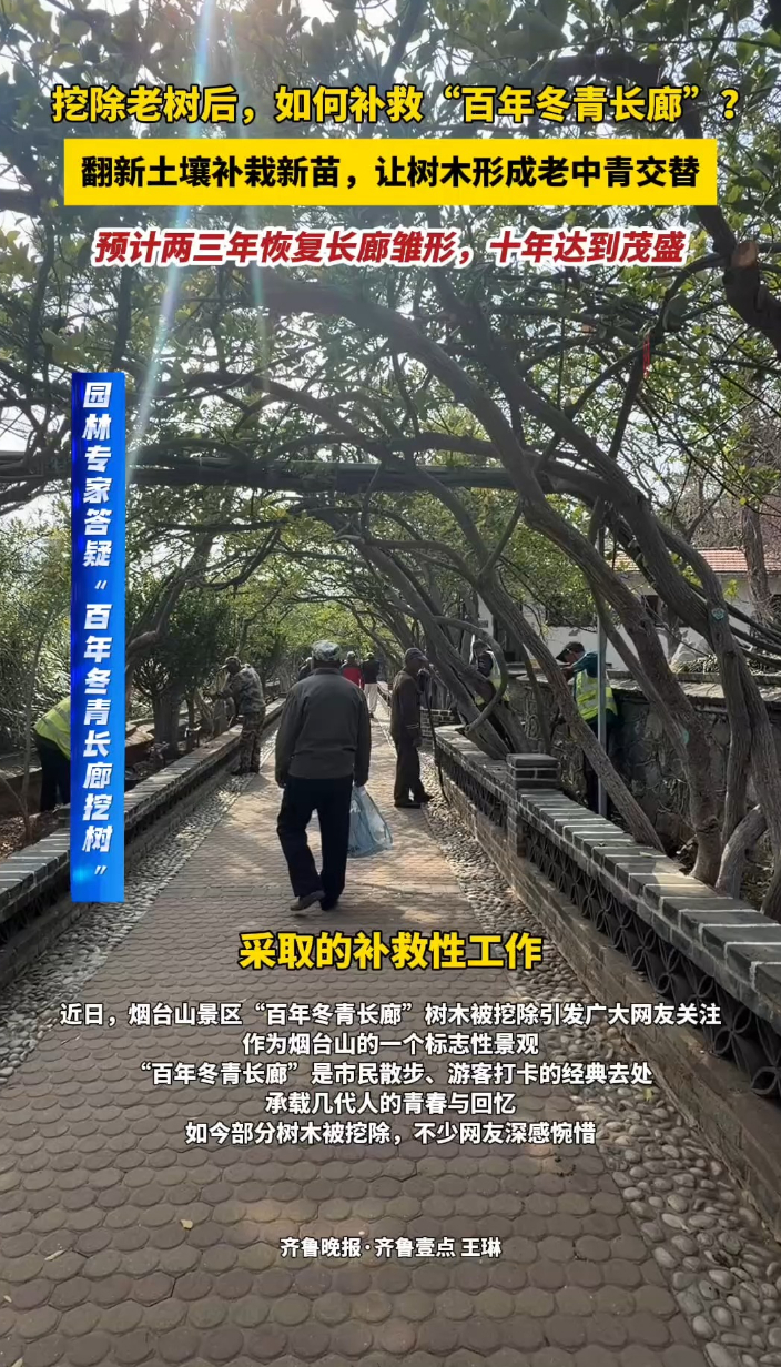果然视频|挖除老树后,如何补救烟台山“百年冬青长廊”?齐鲁晚报·齐鲁壹点客户端 16:49原创近日,烟台山景区“百年冬青长廊”树木被挖除引发广大网友关注。挖除老树后,如何补救“百年冬青长廊”?31日,园林专家针对市民关心的问题进行答疑:此次补救除了挖除老树,还翻新土壤补栽新苗,让树木形成老中青交替,预计两三年恢复长廊雏形,十年达到茂盛状态。 (齐鲁晚报·齐鲁壹点 王琳)
