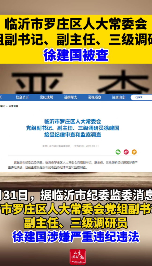 临沂市罗庄区人大常委会党组副书记、副主任、三级调研员徐建国被查山东法制报 | 18:23 大众新闻·山东法制报 微信扫码扫码下载客户端3月31日,据临沂市纪委监委消息:临沂市罗庄区人大常委会党组副书记、副主任、三级调研员徐建国涉嫌严重违纪违法,目前正接受临沂市纪委监委纪律审查和监察调查。