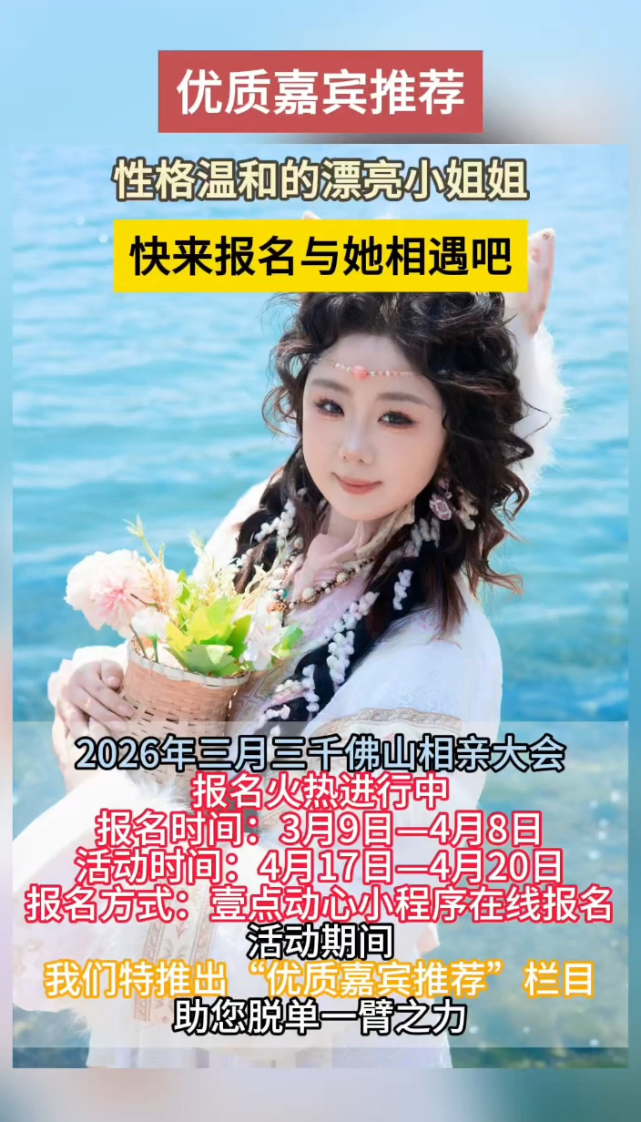 优质嘉宾推荐|00后小姐姐来了!快来报名千佛山相亲大会偶遇吧齐鲁壹点 | 17:06 大众报业·齐鲁壹点 微信扫码扫码下载客户端(齐鲁晚报·齐鲁壹点 赵长春 实习生 于雅雯 李家榕)第20届三月三千佛山相亲大会报名火热进行中,报名截止至4月8日!活动举办时间为4月17日-20日,地点在济南千佛山风景区东门内广场。为了让您的缘分加速抵达,活动期间,我们特推出“壹点动心·优质嘉宾推荐”互动栏目,每天为您优中选优,助您脱单一臂之力!