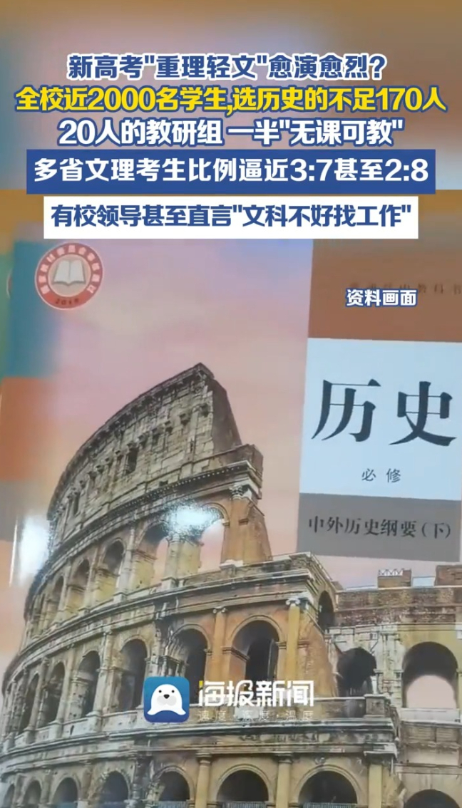 河南一所县中炸出惊人数据:近2000名高一学生,选历史的不足170人,历史班直接腰斩只剩3个;20人历史教研组,近一半老师无课可教,只能坐办公室整理资料、干行政活。