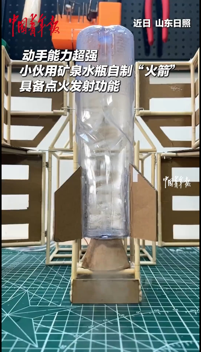 近日,山东日照,男子用矿泉水瓶自制迷你版“火箭”,具备点火发射功能,动手能力超强。