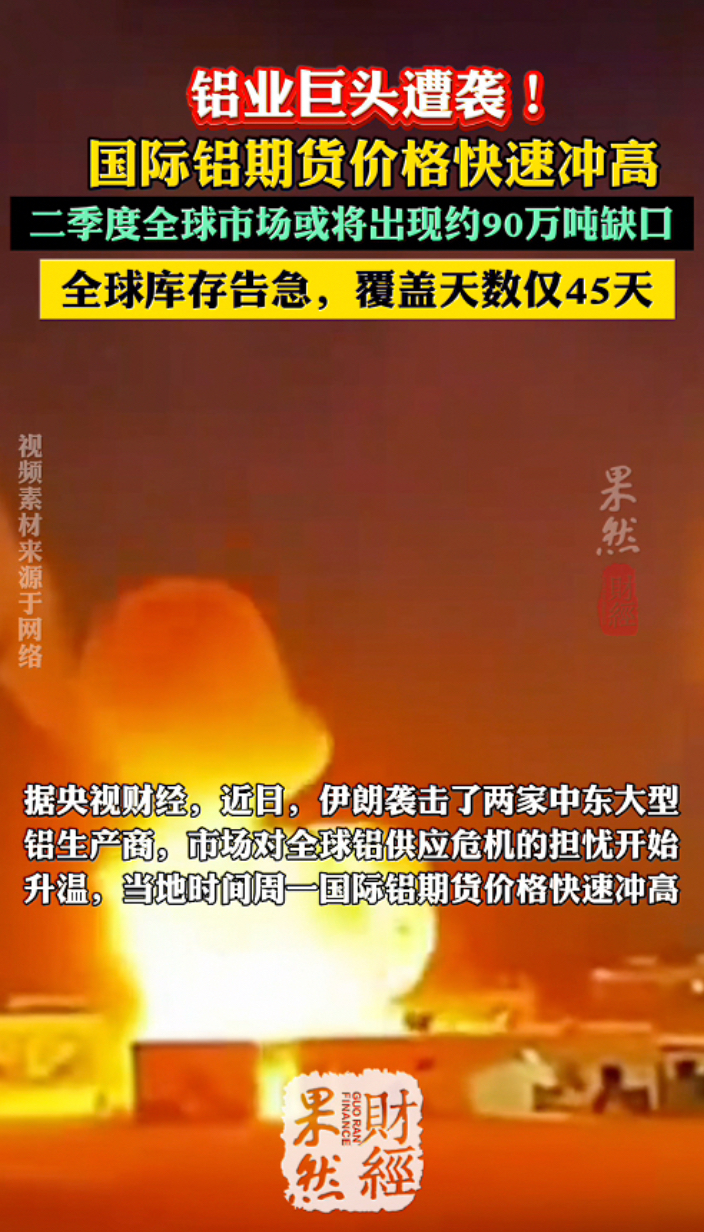 果然财经|铝业巨头遭袭!国际铝价冲高,全球库存告急齐鲁壹点 | 10:08 原创齐鲁晚报·齐鲁壹点客户端 微信扫码扫码下载客户端据央视财经,近日,伊朗袭击了两家中东大型铝生产商,市场对全球铝供应危机的担忧开始升温,当地时间周一国际铝期货价格快速冲高。隔夜,伦敦金属交易所LME铝期货价格一度上涨5.5%,触及每吨3492美元,这是2022年4月以来最高水平。随后涨幅收窄,隔夜市场走势震荡。与此同时,美国铝业公司的股价同步走高。