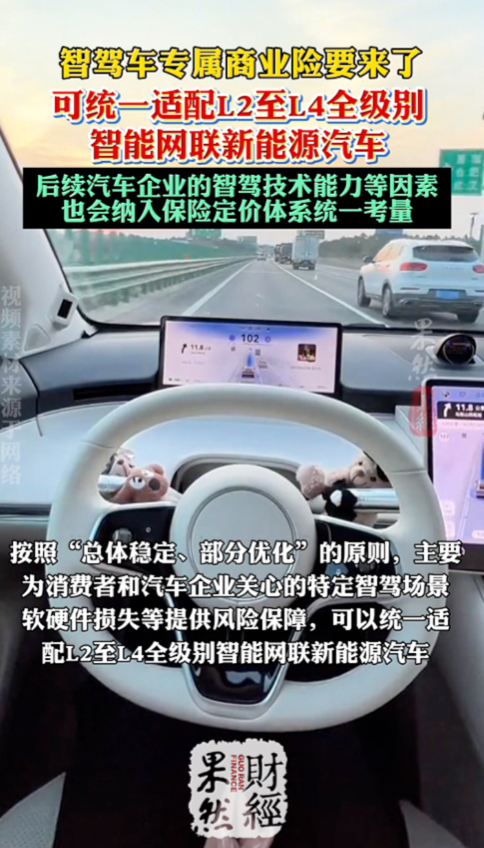 果然财经|智驾车专属商业险要来了!适配L2—L4全级别 11:15 原创齐鲁晚报·齐鲁壹点客户端 微信扫码扫码下载客户端据央视财经报道,目前北京已在全国率先启动智能网联新能源汽车商业保险产品开发应用。新产品基本沿用现有的新能源商业车险体系。按照“总体稳定、部分优化”的原则,主要为消费者和汽车企业关心的特定智驾场景、软硬件损失等提供风险保障,可以统一适配L2至L4全级别智能网联新能源汽车。