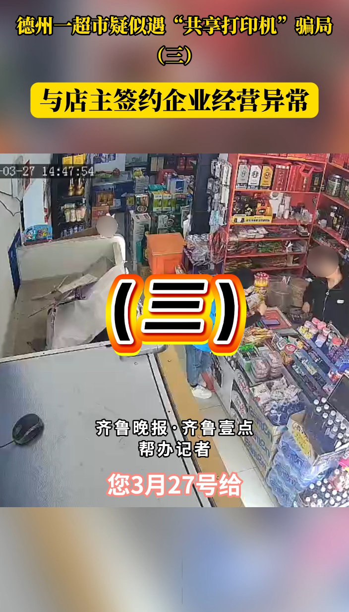 帮办提醒丨德州一超市疑似遇“共享打印机”骗局 (三)齐鲁晚报·齐鲁壹点客户端 14:58原创近日,德州宁津一超市店主聂女士通过齐鲁晚报·齐鲁壹点情报站向记者反映,3月27日下午,其店铺疑似遭遇了一场精心设计的“共享打印机”骗局。三名身着蓝色工装的推销人员以合作为名,分工协作,利用其手机支付宝花呗转走3300元钱。目前,聂女士已向公安机关报案,并希望通过壹点帮办发出提醒,多注意新型诈骗,如遇到及时报警。(齐鲁晚报·齐鲁壹点 刘超 张磊)