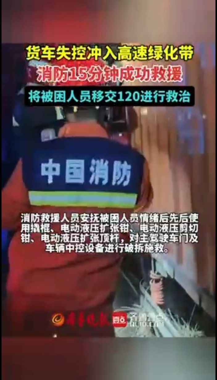 果然视频丨货车失控冲入高速绿化带 消防成功救援齐鲁晚报·齐鲁壹点客户端 15:41原创近日,位于青兰高速灵珠山收费口往济南方向,一辆厢式货车不慎冲进高速旁边绿化带内,有人被困,急需救援。消防救援人员安抚被困人员情绪后,先后使用撬棍、电动液压扩张钳、电动液压剪切钳、电动液压扩张顶杆,对主驾驶车门及车辆中控设备进行破拆施救,经过15分钟紧张破拆,被困人员被成功救出并移交120进行救治。 (齐鲁晚报·齐鲁壹点记者 张晓鹏 )