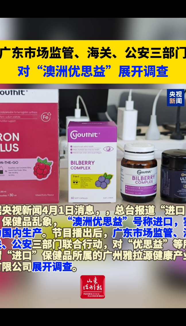 据央视新闻4月1日消息,总台报道“进口”保健品乱象,“澳洲优思益”号称进口,实为国内生产。节目播出后,广东市场监管、海关、公安三部门联合行动,对“优思益”等所谓“进口”保健品所属的广州雅拉源健康产业有限公司展开调查。