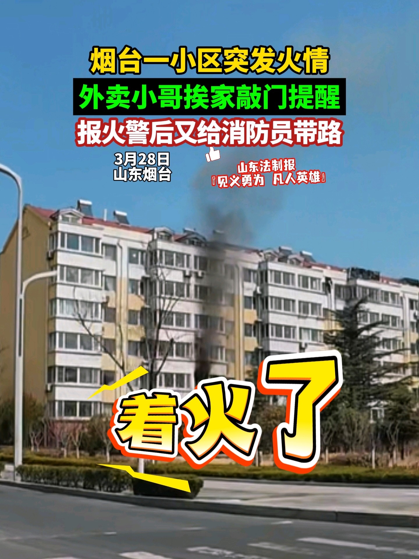 烟台一小区突发火情,外卖小哥挨家敲门提醒,报火警后又给消防员带路山东法制报 | 17:51 原创山东法制报 微信扫码扫码下载客户端3月28日中午,烟台一小区单元楼突发火情。路过的外卖小哥马先生发现后,果断冲进该单元楼,与另一外卖小哥挨家挨户敲门提醒居民,并第一时间拨打119说明情况。消防员赶到后,他主动带路前往着火位置。谈及自己的举动,他说:“谁都会这样做。”(大众新闻·山东法制报记者 羊文智)