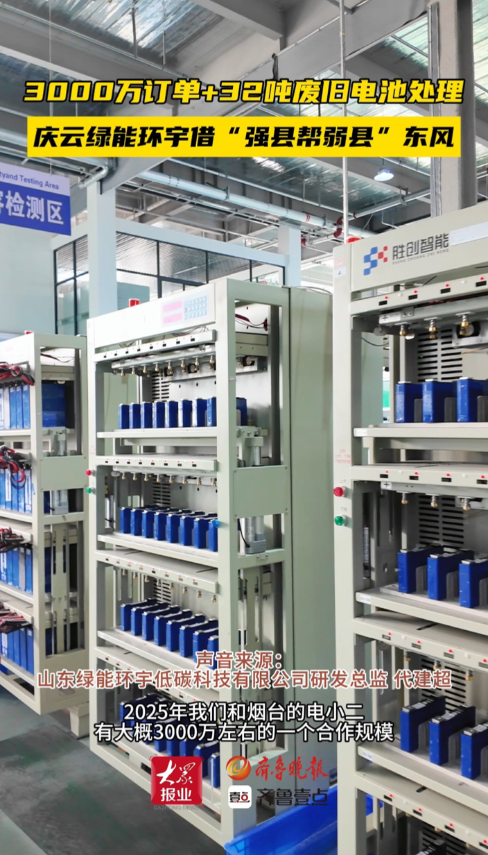 果然视频|3000万订单!庆云一企业借上“强县”东风齐鲁晚报·齐鲁壹点客户端 17:39原创3000万订单、32吨废旧电池处理......庆云绿能环宇借上“强县”东风!(齐鲁晚报·齐鲁壹点 李庆都 李梦晴)