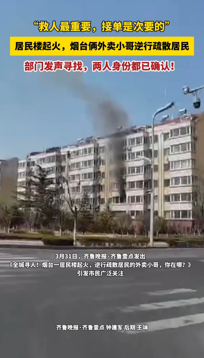 果然视频|“救人最重要”!楼房起火,俩外卖小哥逆行疏散居民齐鲁晚报·齐鲁壹点客户端 昨天23:31原创3月31日,齐鲁晚报·齐鲁壹点发出《全城寻人!烟台一居民楼起火,逆行疏散居民的外卖小哥,你在哪?》,引发市民广泛关注。4月1日,记者从烟台黄渤海新区工委政法委社会工作处了解到,除了马英豪外,另一位参与救援的外卖小哥也找到了,他叫宋平。他表示,看到居民家起火,当时想的就是先救人。(齐鲁晚报·齐鲁壹点 钟建军 王琳)