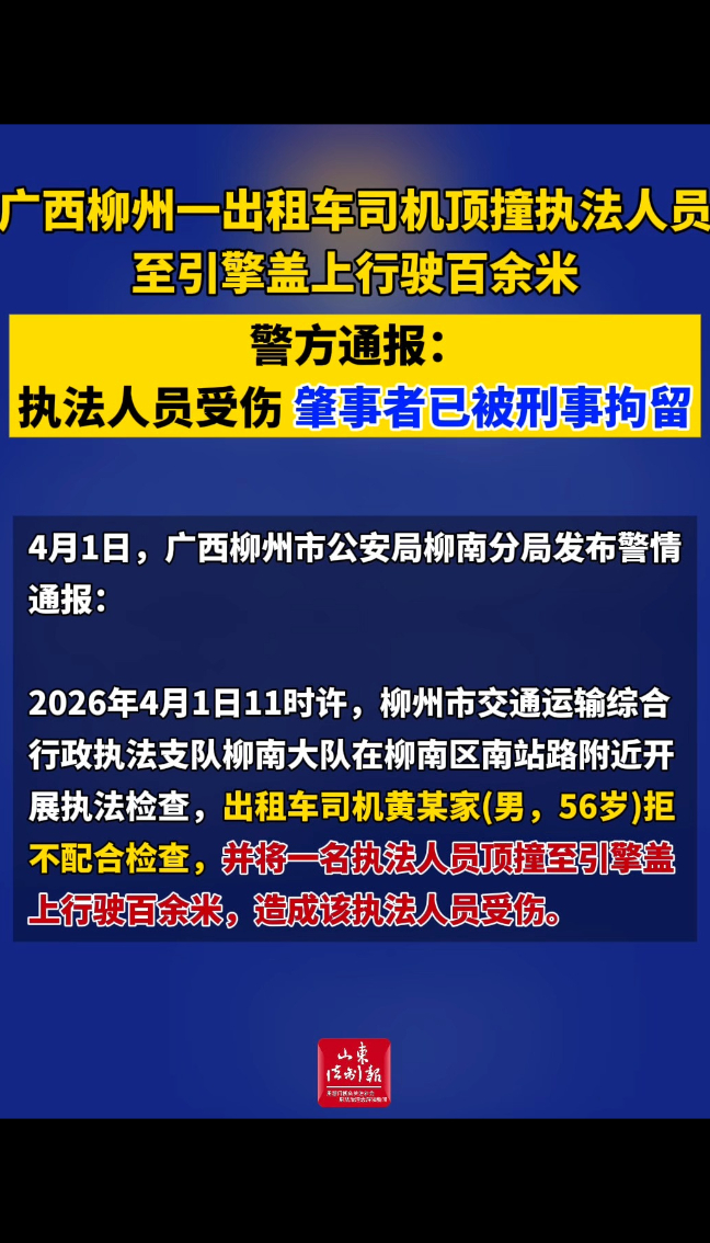 广西柳州一出租车司机顶撞执法人员至引擎盖上行驶百余米 警方通报:执法人员受伤,肇事者已被刑事拘留山东法制报 | 15:26 现场潇湘晨报 微信扫码扫码下载客户端4月1日,广西柳州市公安局柳南分局发布警情通报:2026年4月1日11时许,柳州市交通运输综合行政执法支队柳南大队在柳南区南站路附近开展执法检查,出租车司机黄某家(男,56岁)拒不配合检查,并将一名执法人员顶撞至引擎盖上行驶百余米,造成该执法人员受伤。目前,犯罪嫌疑人黄某家已被刑事拘留,案件正在进一步侦办中。