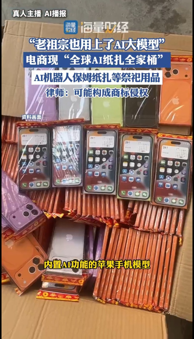“老祖宗也用上了AI大模型”,清明临近,有商家推出“全球AI纸扎全家桶”、内置AI功能的苹果手机模型,售价从20多元到200多元不等,已有数十件销量。商家称这些纸扎品为纯手工制作,甚至有外国顾客咨询。还有商家正在出售智能AI机器人保姆纸扎祭祀用品,页面介绍,其“功能”有端茶倒水、打扫卫生,聊天娱乐等。