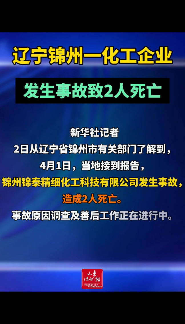 辽宁锦州一化工企业发生事故致2人死亡 17:16 现场新华社 微信扫码扫码下载客户端新华社记者2日从辽宁省锦州市有关部门了解到,4月1日,当地接到报告,锦州锦泰精细化工科技有限公司发生事故,造成2人死亡。事故原因调查及善后工作正在进行中。