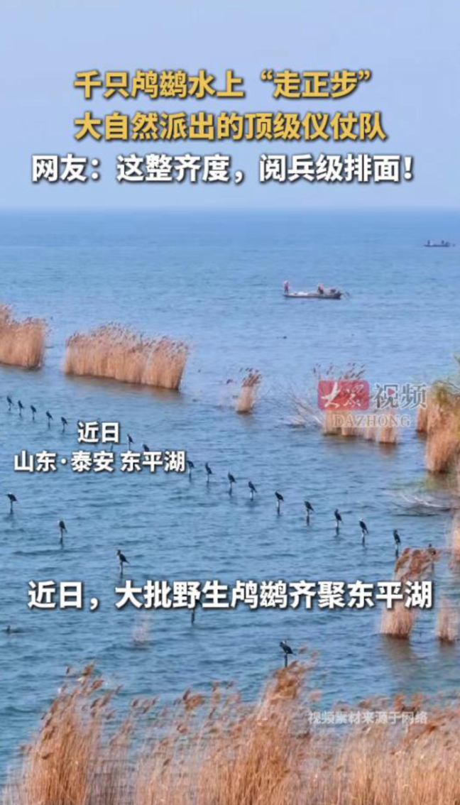 千只鸬鹚水上“走正步” 大自然派出的顶级仪仗队 网友:这整齐度,阅兵级排面!大众新闻 昨天18:50原创近日,大批野生鸬鹚齐聚东平湖,在碧波之上整齐列队,上演了一场难得一见的自然奇观。它们或静立于水面,或列队前行,身姿挺拔,气势十足,远远望去如同整装待发的战士,威风凛凛。如此整齐的“水上仪仗队”,让人直呼太惊艳!(大众新闻记者 王洪涛 实习生 艾文静)
