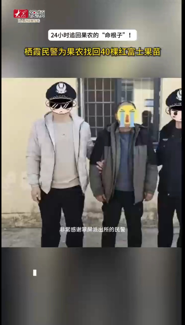 护好果农的“命根子”!栖霞民警24小时为果农追回果苗大众新闻 | 昨天19:28 原创大众新闻 微信扫码扫码下载客户端“我寻思这上哪找去,没想到你们这么快给找着了!”3月17日,栖霞市翠屏街道果农黄先生将失而复得的40余棵红富士苹果树幼苗重新栽回山地果园,脸上满是喜悦,“果苗就是咱果农的‘命根子’。”就在前一天,他的果园遭遇盗窃,而栖霞公安仅用24小时便锁定嫌疑人、追回树苗。(大众新闻记者 邢金钰 通讯员 张志旭 张丙翠)