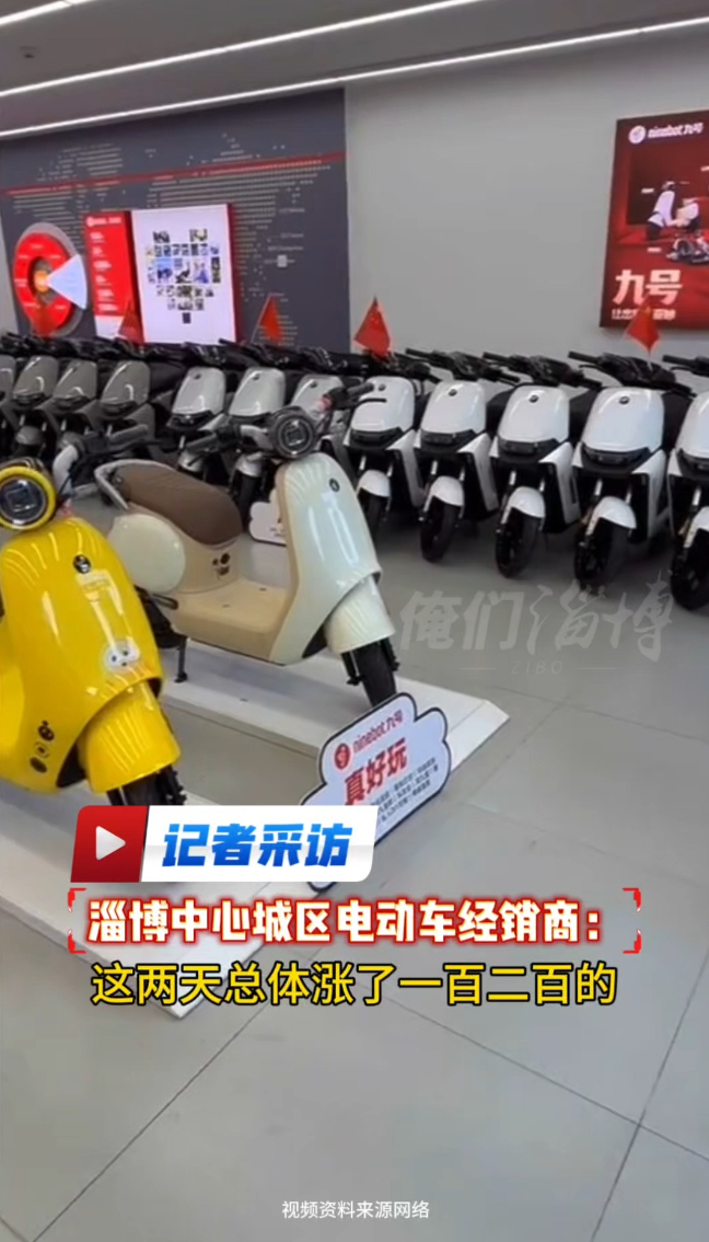 俺们淄博 | 电动车集体涨价?淄博实地探访:真相来了 16:44 原创大众新闻·鲁中晨报 微信扫码扫码下载客户端近日,网传爱玛、台铃、九号、雅迪4月1日起涨价。记者走访淄博中心城区发现,台铃暂未涨价;九号已小幅上涨约200元,但仍比年前价格优惠;雅迪、爱玛均接到涨价通知,暂未执行,预计涨100至300元。涨价原因为铜、塑料、轮胎、电池等材料上涨。(大众新闻·鲁中晨报记者 陆晓茜)