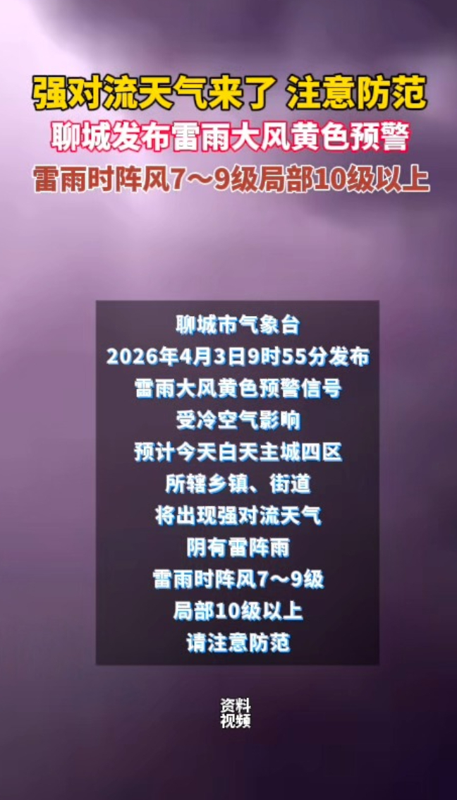 聊城发布雷雨大风黄色预警:雷雨时阵风7~9级局部10级以上大众新闻 17:09原创聊城市气象台2026年4月3日9时55分发布雷雨大风黄色预警信号:受冷空气影响,预计今天白天主城四区所辖乡镇、街道将出现强对流天气,阴有雷阵雨,雷雨时阵风7~9级局部10级以上,请注意防范。(大众新闻记者 胡磊 孙亚飞 李怀磊)