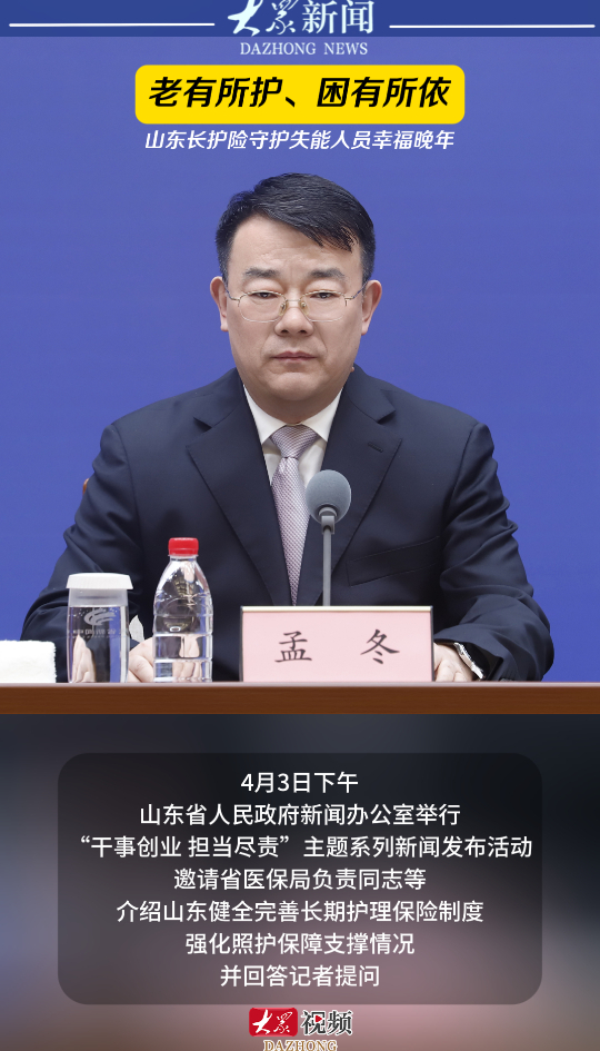 老有所护、困有所依,山东长护险守护失能人员幸福晚年大众新闻客户端 18:28原创4月3日下午,山东省人民政府新闻办公室举行“干事创业 担当尽责”主题系列新闻发布活动,邀请省医保局负责同志等介绍山东健全完善长期护理保险制度,强化照护保障支撑情况,并回答记者提问。(大众新闻记者 高广超 姜倩 策划 马玉峰 王雅洁)