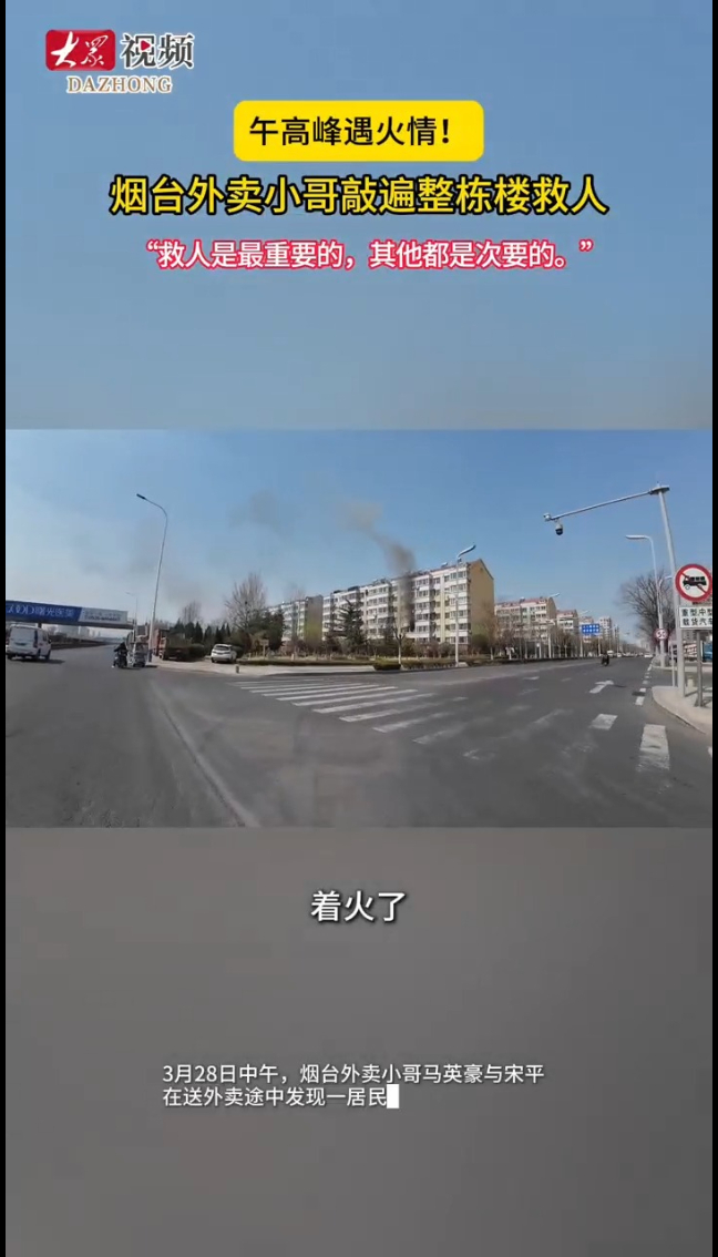 午高峰遇火情!烟台外卖小哥敲遍整栋楼救人大众新闻 | 昨天20:09 原创大众新闻 微信扫码扫码下载客户端3 月 28 日中午,烟台外卖小哥马英豪、宋平送餐时遇居民楼火情,二话不说奔赴现场:拨打火警、敲遍整栋楼疏散居民、引导消防车进小区,确认安全后才离场,为这份凡人善举点赞!(大众新闻记者 邢金钰 烟台黄渤海新区融媒体中心 徐娜)