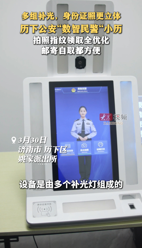 揭秘济南身份证自助服务机:多组补光照片更立体,可邮寄也可自取大众新闻客户端 09:24原创近日,济南市公安局历下分局自主研发的“数智民警”自助服务机在姚家派出所投入使用。全程没有工作人员干预,语音引导清晰简洁,从放置旧身份证(或输入身份证号)、采集指纹,到拍照环节,只需三分钟,每一步都简单易懂。拍照功能可以连续拍摄20多张,不满意就重拍,还能实时预览效果,调整表情、整理发型,直到市民选出自己最满意的一张。(大众新闻记者 汤梾埠 贾馨儒 )