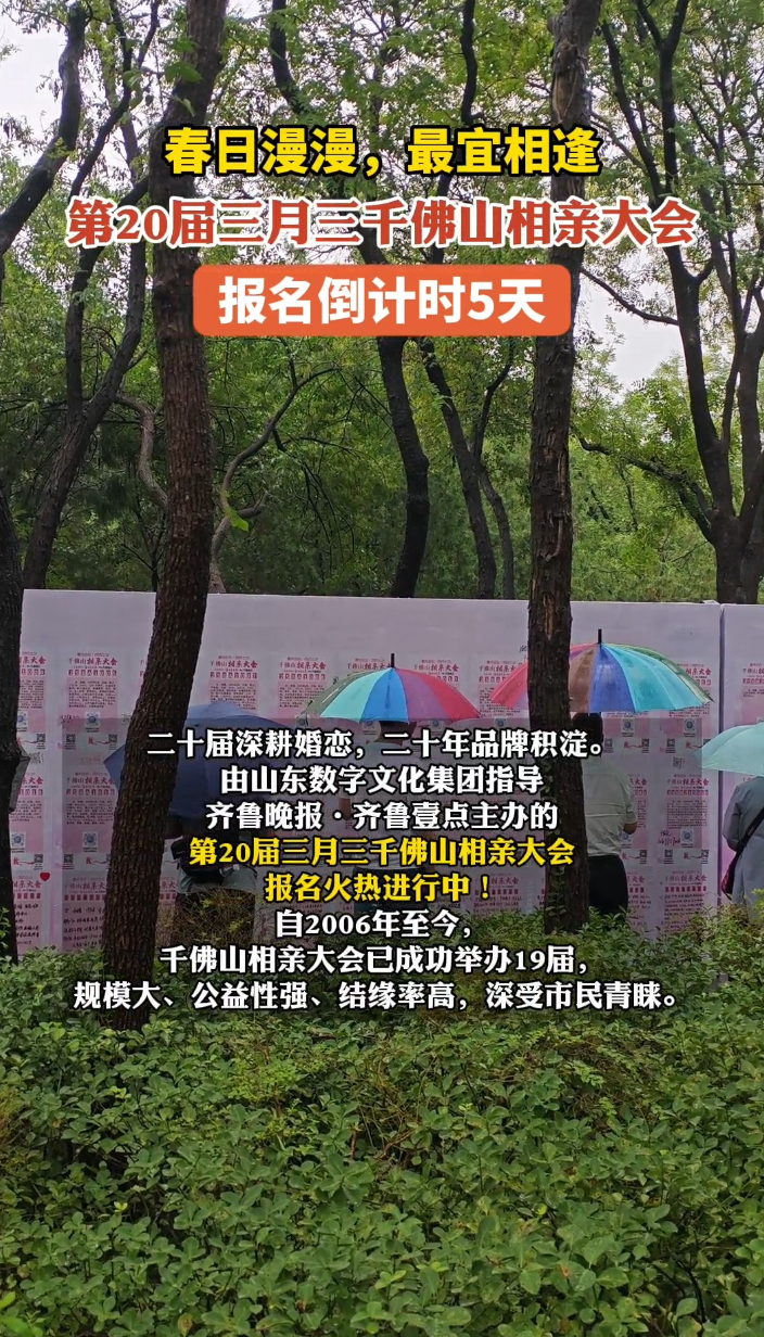 果然视频|春日漫漫宜相逢!千佛山相亲大会报名倒计时5天 13:52 大众报业·齐鲁壹点 微信扫码扫码下载客户端第20届三月三千佛山相亲大会报名倒计时5天!报名时间:3月9日-4月8日,报名方式:壹点动心”小程序在线报名,举办时间:4月17日-20日。举办地点:济南千佛山景区东门内广场,这个春天快来寻找你的心上人吧!