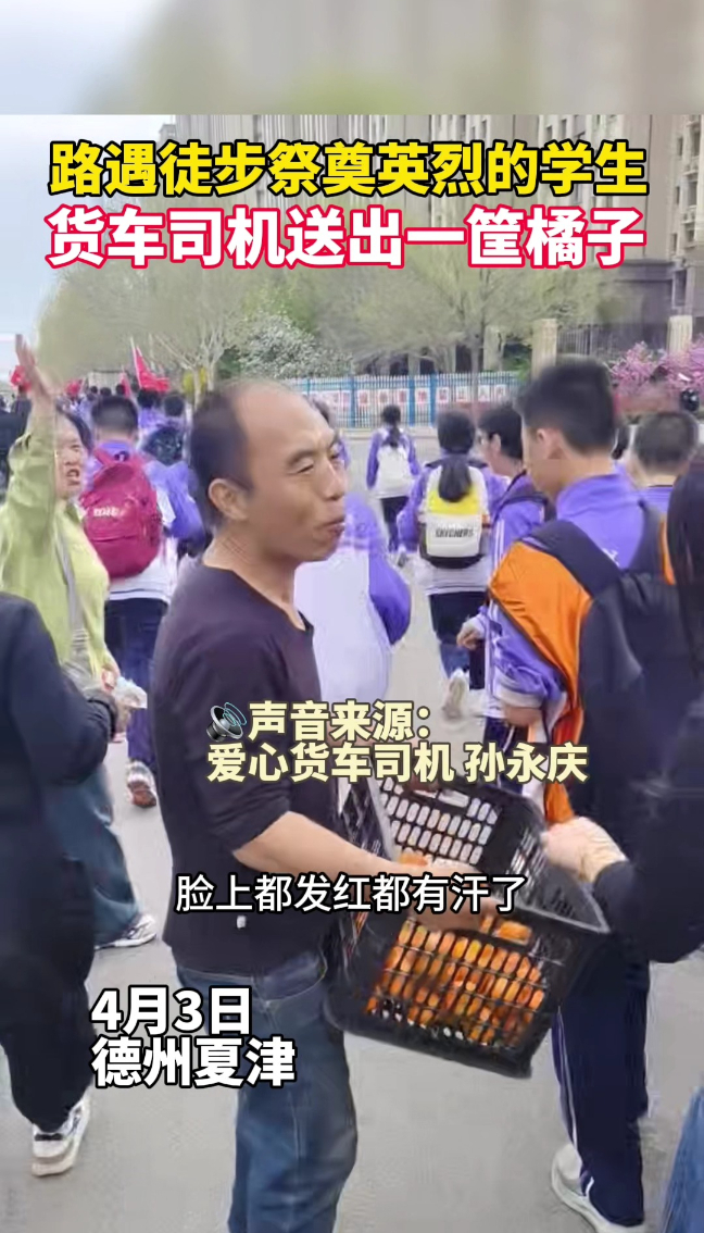 路遇徒步祭英烈的学生,德州一货车司机免费送出一筐橘子大众新闻 昨天20:52现场4月3日,德州夏津,一名货车司机路遇徒步祭奠英烈的学生,深受触动,便将自己从广西拉回来的橘子拿了一筐免费送给学生。(大众新闻记者 贺莹莹 德州晚报记者 张祺媛 通讯员 王荣岳)