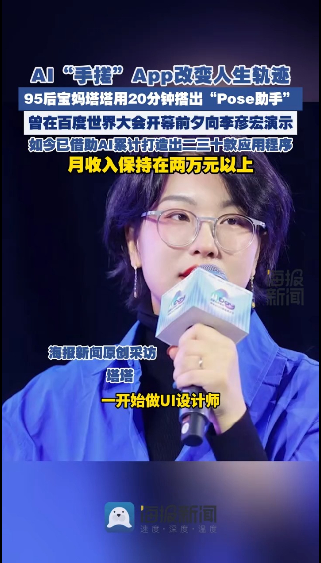 AI“手搓”App改变人生轨迹: “95后”宝妈塔塔用20分钟搭出“Pose助手” 月收入保持在两万元以上 10:52 原创大众新闻·海报新闻 微信扫码扫码下载客户端(海报新闻记者 张海振 金立红 杜郑敏)